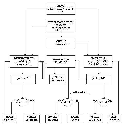 A practical approach may be the following: According to Chrzanowski et al. (1990) the integrated analysis of deformation surveys includes the geometrical analysis of the status of the deformable body and the physical interpretation, i.e. the identification of the dynamic process. Fig. 11 shows an idealized flowchart of the integrated deformation analysis. 'Integrated' means the combination of the geometrical analysis with prediction models.