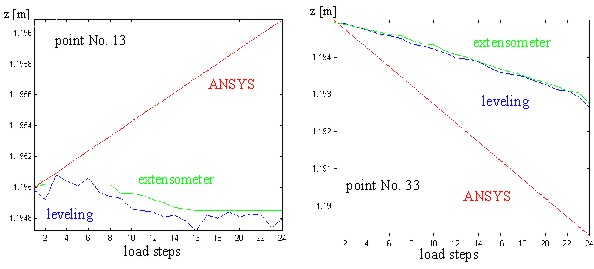 A typical example for the application of parametric modeling of a dynamic system is load trials on constructions. The static behavior of a 10.0 m x 2.0 m shell structure, made of bricks, was investigated (Hesse et al. 2000). The semilateral surface loading (1.0 kN/m², loading step No. 6) of the structure and the settlements predicted using FEM is shown in Fig. 12. The surface loading was stepwise increased from zero up to 4.0 kN/m2 (loading step No. 24). The envisaged break-down of the structure could, however, not be achieved. For two of the monitored points (No. 13 and No. 33) the predicted settlements (ANSYS, system equation) and the displacements measured by means of leveling and extensometers (observation equation) are depicted in Fig. 13. The discrepancy between the prediction and the measurements, in terms of KALMAN-filtering the 'innovation', is quite striking.