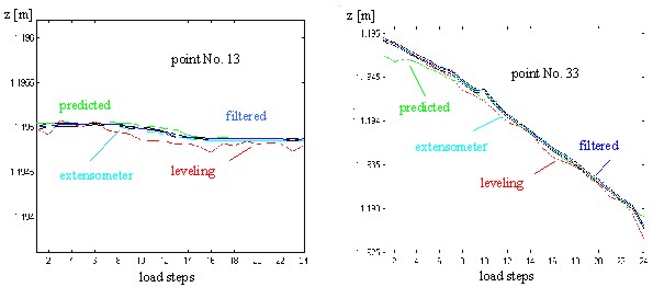 After adaptive KALMAN-filtering the innovation is reduced so that the predicted and filtered settlements are in accordance with the measured values (Fig. 14), there is no significant difference anymore. Adaptive filtering means to identify, i.e. to estimate the material parameters (Young's modulus) of the structure as additional unknown state parameters (state vector augmentation). As a result, the material parameters (physical state quantities) obtain values which differ quite a bit from the original assumptions. Based on the results of the parametric identification, the assessment of the stability and the operational security of the structure is now much more realistic and reliable then it was before.