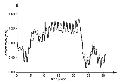 In a second step Fourier transformations were used to get preliminary information on the behavior of the system. The last step relates the temperature changes to the deformations by a SISO identification model which considers the fact that temperature changes effect the foundation pillars over a longer period of time. This model is given by equation (13) which is restricted, however, to the estimation of the non-recursive parameters b0, ... , bp only, where p stands for the memory-length. The solution includes p = 30 significant parameters bk. This model is able to demonstrate that most of the deformations can be explained by the recorded temperature variations (Fig. 15).