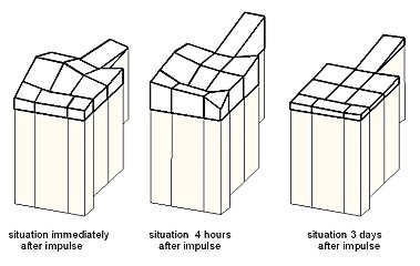 Fig. 16 depicts the reaction of all the pillars of the turbine table to an input impulse of 1 K immediately after the impulse, after 4 hours and after 3 days. The point of this sort of non-parametric system identification is that the model describes the reaction of the object to be monitored in a 'black box' manner. It is meaningful, because it relates input signals (temperature variations as physical causative forces) to output information (deformations of the pillars). It does not contain, however, any information about the structure or at least the significant material parameters, e.g. the coefficient of expansion, of the system which could make evident why the system reacts as it obviously does. The physical interpretation of dynamic processes on the basis of non-parametric models is therefore always limited; the interpretation is symptom oriented.