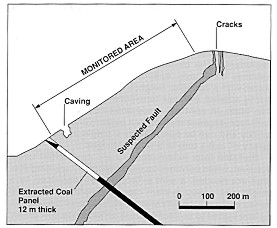 Another typical application of deformation analysis is ground subsidence. The Sparwood coal fields, British Columbia, for instance were observed and analyzed by Chrzanowski et al. (1990). The purpose of the surveys was to monitor ground movements caused by the extraction of a 200 m by 700 m panel of a 12 m thick and steeply inclined coal seam (Fig. 17). Three types of monitoring observations were used under rough climate conditions: tacheometric geodetic measurements, aerial photogrammetric surveys and continuous measurements of changes of ground tilts by automated biaxial tiltmeters. Between 1980 and 1982 the panel extraction (input quantity) produced displacements of up to 2.5 m with surface cavings near the coal outcrop and cracks at the mountain ridge. The best fit model of the displacement field of the complicated deformation pat-tern (Fig. 18) was obtained by applying the combined analysis of all three types of observations (Chrzanowski et al., 1986). The analysis led to a suspicion that there was either a geological fault or a discontinuity in the rock mass was created by the progressing mining activity.