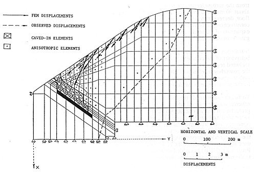 The phenomenon as a whole could not be readily explained. Therefore, a deterministic FE modeling of the subsidence was performed (Chrzanowski and Szostak-Chrzanowski 1986). The modeling was difficult due to the fact that besides the unknown fault parameters also the values of the in situ Young's modulus of the rock were not well known. However, using the results of the geometrical analysis, the deterministic model could be calibrated (adaptation of Young's modulus, insertion of the assumed fault parameters into the analysis). Two FE models were analyzed: one without the assumed discontinuity and one with the insertion of the suspected fault. The FEM results with the fault gave incomparable better agreement with the observed values of the displacements. The final result obtained from this static model is shown in Fig. 19. The findings of the integrated analysis led to the closing of the mining operation to prevent a potential slope failure. The example demonstrates that parametric description, i.e. deterministic modeling, of geological phenomena, though difficult to perform, may lead to useful physical interpretation of deformations if properly combined (calibrated) with the geometrical model. Apart from parameter matching according to Fig. 6 also the identification of the unknown structural properties as for instance the fault zone geometry is crucial for an appropriate solution.