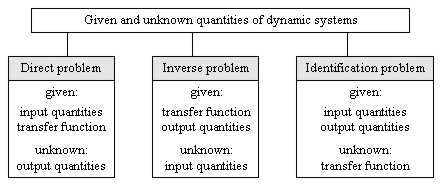 System analysis (direct problem) requires the input quantities and the transfer function to be known. The reaction of the system is in this case the unknown quantity. At last, the identification problem derives the transfer function from observed input and output signals.