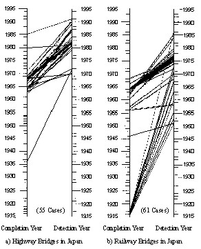 Fig. 3: Completion year and damage year of highway (a) and railway (b) bridges in Japan (SFB 477-2000)