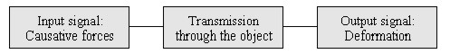 Advanced evaluation models for deformation analysis do not only consider the change of the geometry of an object in space and time. They rather investigate and incorporate also the influencing factors (causative forces, internal and external loads) causing the deformation. They regard in addition the object's physical properties (material constants, extension coefficients, etc.) which are characteristic and responsible for the response of the object to the acting forces. The three elements 'acting forces' as input signal, 'transmission through the object' as transfer process, and 'response of the object' as output signal form a causal chain or - according to the terminology of system theory - a dynamic process or a dynamic system (Fig. 5).