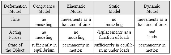 A summary of the studies can be described as follows: The deformation of an object is the result of a process. The today's techniques offer the possibilities to measure and analyze such a process in all details. This is in accordance with the current trends in engineering surveying which intend to determine not only the geometrical changes of an object in a phenomenological manner but rather the dynamics of the process, i.e. the investigations aim at incorporating the causative forces and the physical properties of the body. In its entirety, the body, the causative forces and the resulting deformations are considered a dynamic system. Consequently, the most general and comprehensive models are dynamic models, from which - by simplification - static, kinematic and congruence models are derived. The simplified models offer the possibility of meeting many practical aspects of deformation analysis which do not necessarily require the complete investigation of the process in all details.