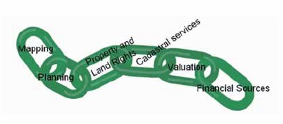 The meeting brought together leading actors from the public, private and non-governmental sectors working on land and housing finance issues. The seminar focused on the essential elements of a just and sustainable provision of adequate shelter, from the twin perspectives of land and finance. The role of land and finance provision can be conceptualized as the challenge of linking the various components of “the Land Administration Chain”: mapping; planning; property and land rights; cadastral services; valuation; financial services (see figure below).