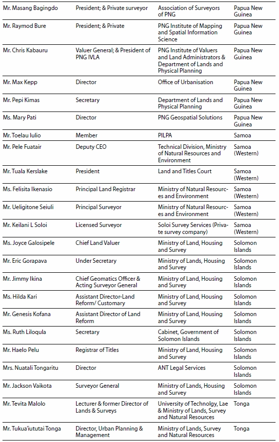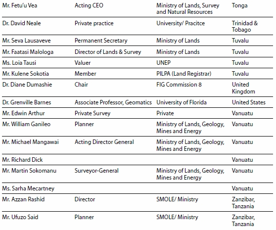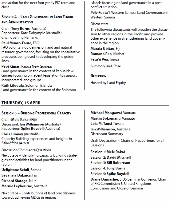 Dialogue is not delivery. Therefore, the seminar aimed to produced an agenda for action on building the capacity of land professionals in the region. This includes some general guidance and professional ethics; guidelines on developing vehicles for building land professional capacity; guidelines on building roles and responsibilities for land professionals; and institutional responsibility for driving an agenda for SIDS specifically in the Pacific Region. The Agenda for Action is outlined in section 3 below. Although the Agenda for Action is developed for the Pacific Region it has direct relevant for SIDS across the globe.
