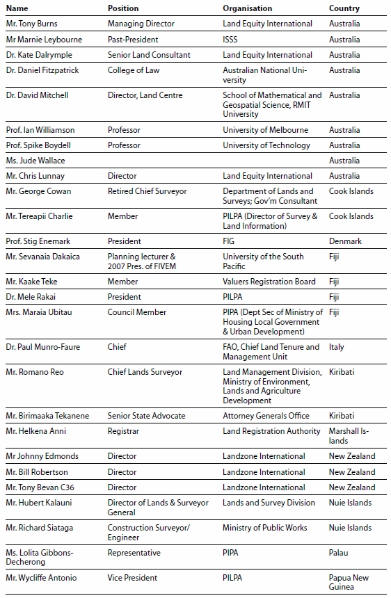 The seminar was organised by Dr. Diane Dumashie, Chair of FIG Commission 8, Director of Dumashie Ltd, UK with a lead team consisting of Dr. Mele Rakai, President of PILPA and CASLE Pacific, University of South Pacific, Fiji, Mr. Tony Burns, Managing Director and Kate Dalrymple, Land Equity International Pty Ltd, Wolongong, Australia; Dr. David Mitchell, Royal Melbourne Institute of Technology, Australia, and Mr. Bill Robertson, Director of Bill Robertson Associates, New Zealand. FIG would like to thank the members of the lead team for all their great efforts in organising this seminar and also drafting the “Sydney Agenda for Action” for consideration and adoption by the seminar.