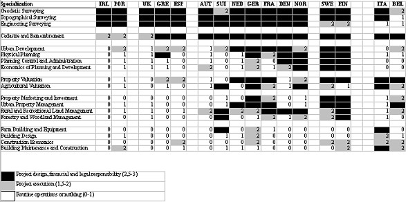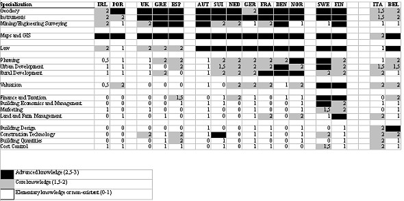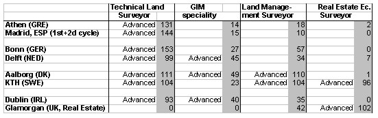 Table 1. Education profiles at investigated universities (in grey fields ECTS credits taken from figures 3-10; one year is 60 credits). Profiles Mattsson (2000) divides surveyors into three main groups, namely: technical land surveyors, land management surveyors and real estate economics surveyors. This subdivision is open to question and can, of course, be made in many other ways. Its advantage is that it points to three clear main directions, namely; surveyors with purely measurement and cartographic duties, surveyors responsible for property formation and, to a varying extent, for land consolidation and land development, and, finally, surveyors who have developed their real estate expertise for valuation and management. These specialities provide an indication of the way in which education can be developed. The dynamic field of geographic information management (GIM) has not given rise to any surveyor title in the present survey, and opinions differ as to whether GIM is to define a separate group of surveyors in Europe or is merely an adjunct to all existing categories. Table 1 shows the maximum scope of courses in core subjects (ECTS credits taken from figures 3-10), to indicate the occurrence of advanced studies. It should be added that this does not give a fair picture of Ireland, since universities with general practice have not been included, nor for the UK, owing to the exclusion of universities with technical/land surveying. It must also be remembered that specialities taken conjointly with other study programmes, especially civil engineering, have not been included in this survey. This affects three specialities in Greece, two in Sweden and one in Denmark. As can be seen, Aalborg and KTH have succeeded in constructing study programmes which are advanced in three fields at the same time. Two such fields have been adopted in Dublin and Delft, while other study programmes achieve only one advanced speciality. It should be explained that a study programme is judged to have an advanced speciality if at least one-and-a-half years' studies (90 ECTS credits) is devoted to core subjects for one main speciality. For GIM, as a new subject, the threshold has been pitched lower (40 ECTS credits). Although the reasons for differences in educational profiles may be questioned, the basic cause lies in the land surveyors' present or previous responsibility for property formation. A historically rooted, extensive responsibility has facilitated breadth of study programmes and profession. In the Nordic and Anglo-Saxon countries, for example, this has led to clear specialities.