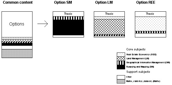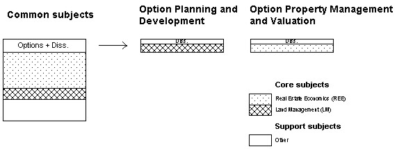 Figure 10. Surveying education for Planning and Development Surveying and Property Management and Valuation (3 years) at University of Glamorgan, Wales. (Source: UG 2000) United Kingdom In the UK, as in other countries, there is a need for technical surveyors, but as it does not have a cadastral system in the German or Nordic sense, surveyors have no legal responsibility for property formation. Previous knowledge of land consolidation has disappeared. However, the UK has developed real estate expertise more extensively than elsewhere through the early establishment of other types of surveyor, e.g. general practice surveyors specialising in real estate appraisal and property economics (Thompson 1968). In this connection, an observation by Mattsson (2000) is perhaps worth mentioning. If a study programme includes all core subjects from surveying (SM) via land management (LM) to real estate economics (REE) and none of these is purely marginal, the consequence may be that the programme cannot be held together, even if options or various concluding specialities are devised to provide specialisation. Bearing in mind that fragmentation tendencies can be observed in Finland and Sweden, a surveyor education programme can result which will include no technical subjects at all. This example, taken from the UK, can provide an indication of the direction in which things may move if real estate economics becomes a successful and extensive subject in its own right. It is worth noting that the UK has more than a hundred surveyor study programmes at upwards of 50 universities or corresponding higher education establishments. Most of these programmes are property economics related (general practice surveyors). About 10 establishments provide technically oriented programmes (RICS, nd). From this large number of programmes, one has been selected, namely; the study programme at the University of Glamorgan. This is a three-year B.Sc. programme. A M.Sc. programme could also have been chosen, but this would add very little to the results obtained from Glamorgan. The most important factor is to show the total absence of geodesy and other technical surveying subjects (fig. 10). Most significant of all, however, is how courses in real estate economics completely dominate the study programme, even though it has two specialities. In addition, there are land management courses, and also support subjects, dealing mainly with building and planning. To some extent students have a free choice of support courses. About 80 per cent of the courses are common core. Specialisation covers just over half a year and runs parallel to compulsory courses after the first year. One speciality is Planning and Development Surveying, the other is Property Management and Valuation. Curricular comparisons