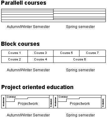 Figure 11. Pedagogical models for course structures. Pedagogical model for course structureTurning to consider the pedagogical aspect of course structures, three main types are distinguishable, viz: 1. Parallel study of perhaps 5-8 subjects in one term. These structures are exemplified in figure 11. Parallel studies appear, by all accounts, to be the commonest arrangement. Between 5 and 8 courses are taken simultaneously and may be allotted different numbers of hours per week. Examinations in all courses are often held at the end of term. This arrangement is employed, for example, at Spanish universities and at certain German universities. In Spain about 7 courses are taken in parallel. In Germany 5 or 6 or perhaps even more courses can be taken in parallel. There are frequent mixtures of compulsory and optional courses. The parallel study system makes it possible to offer very small courses. It is also possible to mix limited courses and extensive ones. In addition, it ought, logically, to be quite easy to change courses, should that become necessary. With many courses being taken parallel, however, there is a risk of knowledge becoming fragmented in such a way that the students have difficulty in relating the content of courses to a wider context. Another disadvantage is the lack of time for concentrating on one subject. Critics are wont to say that the system is characterised by last-minute swotting. Advocates sometimes argue that this is one way of teaching the students to effectively keep several balls in the air at once. The block system is usually based on only two courses being taken in parallel. Altogether, four courses are normally taken per term, but two or three are also possible. One course may last for a full term, while another runs parallel for the first half-term and a third follows in the second half. Since every term usually comprises 3 or 4 courses, each course, as a rule comprises at least 7.5 ECTS credits. There is no room for smaller subjects, and these, consequently, have to be integrated with other subjects. The idea is to avoid excessive fragmentation of knowledge. The longer, 15 ECTS credit, courses commonly include projects corresponding to those of the project-oriented study programmes (see below). The projects in these larger courses are supported by means of supplementary lectures and seminars. The pedagogical idea is for the students to take the opportunity of concentrating on the subject studied and to let it ripen undisturbed by other subjects, while at the same time providing some variety by dividing the time between two subjects. KTH in Sweden applies this pedagogic. The block system also provides an opportunity for the distinctive building up of studies in such a way that each new block rests on one or more previous blocks and constitutes the foundation of other blocks to follow. Project-oriented studies are distinguished through students running major projects on their own. Teachers and students together choose the projects, after which the students explore their way ahead in reading matter and reality in order to write a project memorandum in the form of a lengthy essay on the subject chosen. While project work is in progress, courses - "just-in-time courses," as the Americans would call them - are provided in support of the project. The project-oriented pedagogic is applied at Aalborg in Denmark. All lecture courses support the projects and are included in their evaluation at the end of term. Thus, there are no self-contained courses unconnected with projects, except for a few introductory lecture courses during the first half-year of basic training. Project-oriented education is distinguished by the students learning to track down knowledge for themselves - a pivotal skill in a changing world. Thus, the pedagogical idea is that, although knowledge itself is important, the methods for seeking it are even more important. In addition, the students' own activity stimulates their acquisition of knowledge, and knowledge ripens when sought individually over a considerable length of time. Examination and quality assuranceThe nature of European universities has changed dramatically over the last decades from being traditionally elitist educational institutions to mass education organisations with a responsibility towards a steadily growing part of the population. This, combined with tighter public budgets in higher education, has led to an increasing focus on the quality of the education provided. Consequently, different types of quality assurance and assessment systems and initiatives have been established throughout Europe. Quality assurance refers to "…the means by which an institution satisfies itself that standards and quality of its educational provision can be maintained and enhanced" (FIG 1999). Three main areas can be identified: