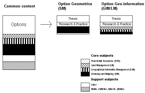 Figure 6. Surveying education (5 years) at Delft University of Technology. (Source: TUDelft 1997) The Netherlands Land surveyors in the Netherlands also have historical experience in surveying and cadaster work including land consolidation, but appear to have lost much of their exclusive responsibility in the property sphere. Surveyors (geodeet) in the Netherlands are trained at the Delft University of Technology. The training takes five years. The number of applications is low and only ten students began the programme in the autumn term 2000. The educational profile is shown in figure 6. All students take common courses lasting three years, including nearly one-and-a-half years of support subjects. One half of these studies comprises foundation courses such as mathematics, statistics and IT, while the other provides further basic courses. The latter can be foundation courses for the understanding of core subjects, but they can also be freely chosen if students wish to construct individual educational profiles. Core subjects are dominated by surveying courses and last for one year. GIM subjects have also been allotted a relatively prominent position, occupying about half an academic year. Land management subjects are somewhat less significant. After just over three years the students choose a speciality - either Geometrics (SM) or Geo-informatics (GIM/LM). Within these specialities there is a choice of different combinations of subjects, and this is why figure 6 only shows a basic structure for the main directions. The Geometrics speciality, in principle, comprises entire courses focusing on surveying. The Geo-informatics speciality is more differentiated and comprises surveying, GIM, land management and also a minor element of real estate valuation. The student is also required to include a research period (0.1 academic year) and a work assignment period (0.3 academic year), and also to write a thesis (0.5 academic year). Both the research period and the work assignment period are included in the speciality. The training in its present form was introduced in 1996 but has been modified since then. At present it is again under review and may therefore be changed within the next year or so. This review forms part of a total review of the organisation of studies at the Delft University of Technology. The direction of development seems to be that all core subjects are downgraded except GIM at the same time as the scope for projects is increased.