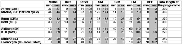 Table 2. Support and core subjects at investigated universities (in grey fields minimum and maximum ECTS credits taken from figures 3-10; one year is 60 credits). Germany and the Netherlands merit special attention. In Germany university courses have acquired an overwhelmingly technical focus, in spite of the profession's extensive responsibility for property formation and its general wide field of practice. The reason for this can be explained by a compulsory traineeship with an emphasis on law that has to be completed in order to qualify for cadastral work. In this way, a lot of surveyors obtain additional essential knowledge. As a result, in order to carry out the full scope of its work effectively, the profession seems to have become dependent on not only academic training but also practical experience gained in the public sector. The question is whether this will prove viable in the long term. In the Netherlands it seems even more problematic as the university's main focus is on research, not on professional profiles. About a third of the most recent graduates took up land management activities after their university course, but despite this, land management continues to be a declining area at the university. GIM Sometimes it is said that the training of surveyors, like the profession itself, should increasingly have GIM/GIS/LIS/GIT as a unifying link between technology and social science. This explains why GIM is handled separately in the figures above. A special study, however, will also be made of the GIM subjects, although it must be realised that there can be a significant proportion GIM in a number of subjects without their being assigned to GIM for that reason. There are clear links with geodesy and photogrammetry, but also with market analyses for property valuation and planning. If anything, then, it is the IT interests of the teacher and the financial resources of the university that determine the proportion of GIM in different subjects. As will be seen from table 2, where GIM is concerned, the study programmes can be divided into three groups. Aalborg is unique with its extensive compulsory ingredient. The next group comprises Delft, Dublin and Madrid. Other countries have relatively marginal elements of compulsory courses. If options (the maximum alternative in the table) are also taken into account, we obtain much the same ranking order, though Delft and Dublin in this case rise to the same volume as Aalborg. We conclude that certain study programmes have focused more on GIM while in others it has not been given priority. Most of the universities come midway between the two extremes. GIM has also been compared with the surveying elements (SM). This brings out the limited extent of GIM still more clearly, with the exception of Aalborg, Delft and Dublin. In countries with strong land management profiles, i.e. Denmark (Aalborg) and Sweden (KTH), radically different views are taken of GIM in the existing study programmes. Aalborg has advanced studies while those at KTH are almost negligible. It is worth mentioning too, that GIM and land management are linked together at Delft while constituting alternatives at Dublin. Finally, KTH and Glamorgan have extensive studies in real estate economics, while both of them lack or have only marginal elements of GIM. This may seem odd, since GIS is probably a powerful instrument for analysing property markets. Support subjects The volume of mathematics/statistics etc. and IT respectively are often discussed in connection with study programme revisions. These subjects are obviously needed with a view to further studies of core subjects, but the ease with which mathematics could become a flagship subject at institutes of technology should not be discounted. All the study programmes described are located at universities of technology or the equivalent, Glamorgan excepted, and so it may be interesting to consider the scope of mathematically oriented subjects. To do this, the data related courses must be separated from Maths related courses. The volume of these courses can be seen from table 2. Programming and database courses have been assigned to a separate column (Data). The table shows the minimum and maximum ingredients in the figures presented earlier (figures 3-10). All countries run at least one semester mathematically oriented courses, except Aalborg, where maths has been reduced by half. Oddly enough, there are no great differences between maximum and minimum values within the individual countries, although the wide choice of options on offer suggests that very different mathematical skills would be required for admission to these courses. It is worth pointing out that the IT element of the studies, thus isolated, is probably underrepresented, given the fact that modern surveyor training is unlikely to be without computer use, and this applies to all core subjects. The element of IT varies between 0 and 18 ECTS credits. Presumably, however, this type of knowledge is for some universities included in SM or GIM courses. The connection with civil engineering study programmes in Greece is revealed by the large proportion of Other. Spain too, has a large number of support courses. It is interesting to note that this proportion is high in countries with a small element of land management courses. Voluming of studies In this connection it will perhaps be interesting to speculate, with the aid of a specimen calculation, on the voluming of studies. Assuming a need for some 500 technical land surveyors and 500 land management surveyors with advanced academic qualifications at master's level per 10 million inhabitants, then Germany would need a total of 8,000 highly qualified land surveyors of these two categories and Sweden 1,000. If the annual need for replenishment through graduation is estimated at 5 or 10 per cent of the professionally active, between 400 and 800 would need to be trained annually in Germany and between 50 and 100 in Swed